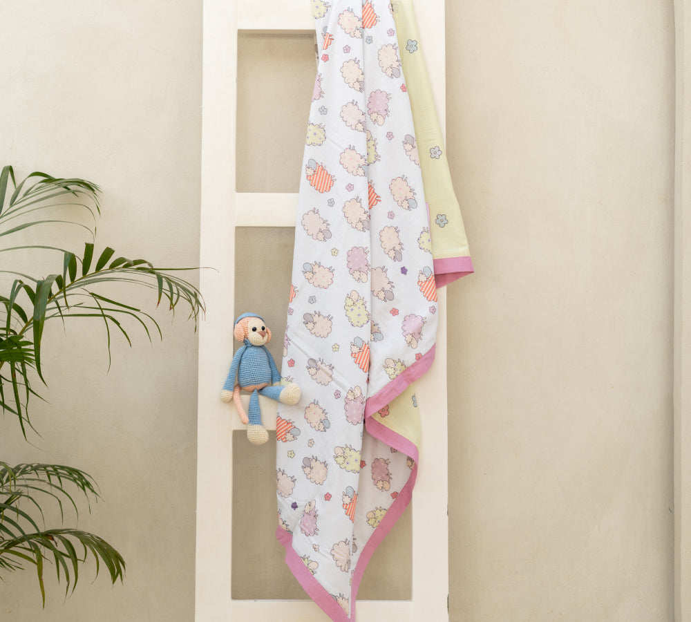 The London Calling dohar is designed for warm-weather comfort,featuring an adorable twist on the classic nursery rhyme.The charming sheep print is playfully balanced with the delicate florals in soothing pastel hues,creating a sweet touch.